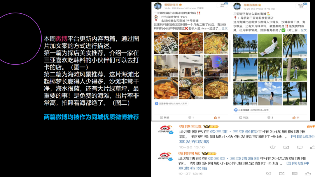 在周报汇报中,有些小组拍摄并发布的抖音视频获得了不错的观看量和点赞量——这些视频通过精美的制作和吸引人的内容,吸引了大量用户的关注和喜爱。同时,还有部分小组发送的微博登上了三亚同城旅游推荐板块,阅读量超过了1.2万,仍在持续增长。