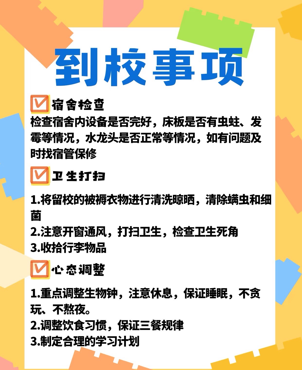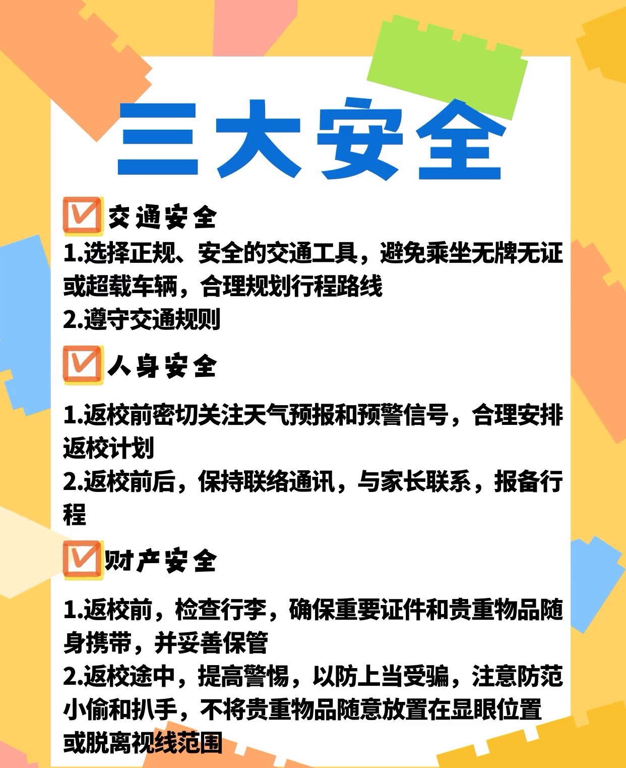 公司暖心提醒同学们要提前规划行程,预留足够时间前往学校,避免因交通拥堵等突发情况延误。做好个人防护,同时,保持通讯畅通,随时与家人和学校老师保持联系,告知行程进展。带齐个人证件如员工证、身份证等。到达学校后,及时整理内务,保持宿舍整洁卫生。在校园内,大家也要注意安全。严格遵守“四禁”的规章制度,保护好个人隐私信息和财产安全。