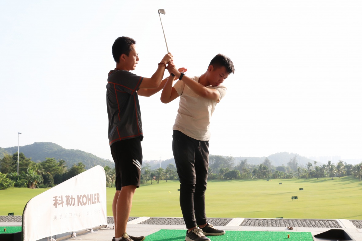 接着,两位学长带领同学们做打球前的准备运动并做出讲解,包括手脚腕、关节、腰关节、专业的高尔夫体转动作、挥杆动作等内容。在此期间,两位学长细心、仔细的向大家展示分解每一个准备运动的动作并加以解释,吴兰卡老师也在一旁耐心指导每一位同学的动作。一些专业动作大部分新生都是第一次接触,尽管在练习时难免略显笨拙,但所有同学都非常认真的学习打球前的热身动作,最后一项也是最激动人心:打球。高尔夫魅力难挡,每位同学都跃跃欲试,在班委的组织下,所有同学每五人一组,分别开始了高尔夫亲身体验,在场的各位学长都耐心的一对一的对练习打球的同学进行指导。面向高尔夫球场的青青草地,在每位同学不尽相同的面容上出现了极其相似的笑容。