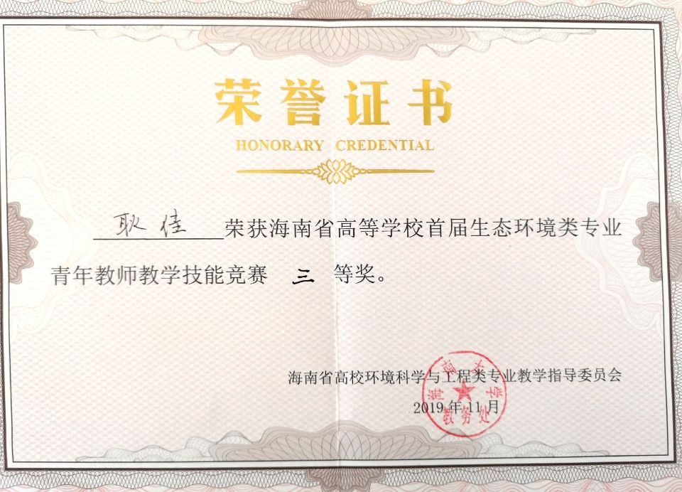 耿佳老师荣获海南省高等学校首届生态环境专业青年教师教学技能竞赛三等奖
