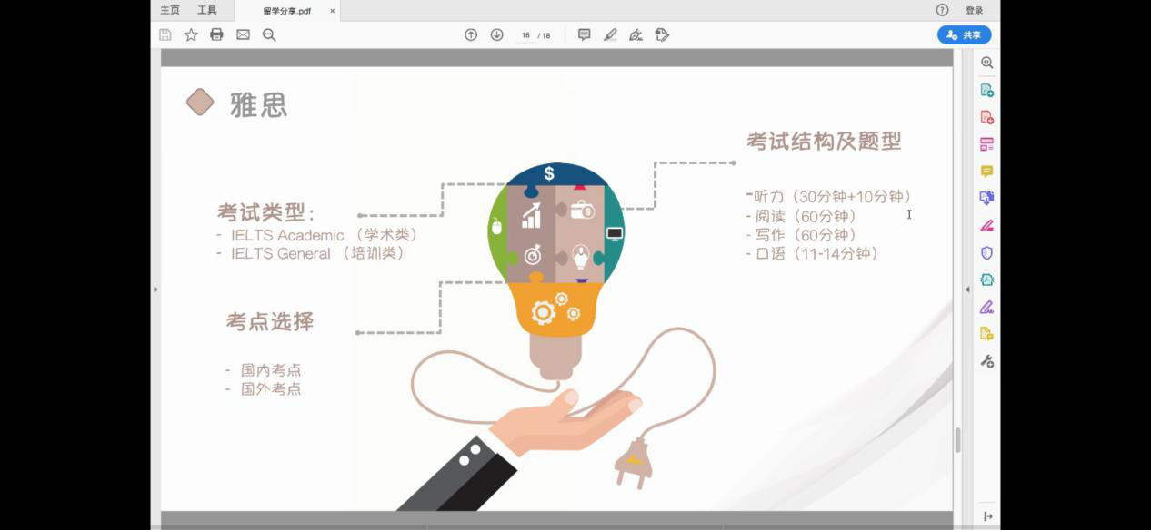 最后,韩冰老师在雅思考试方面,对我们进行了适当介绍。雅思考试分为听力、阅读、写作和口语,阅读四篇,写作两篇,口语有日常用语、抽取专题以及在此基础上展开的即时提问。而每个考点的评判标准有所差异,韩冰老师建议我们在连续失利的情况下,试着换一个考点,或有奇效。
