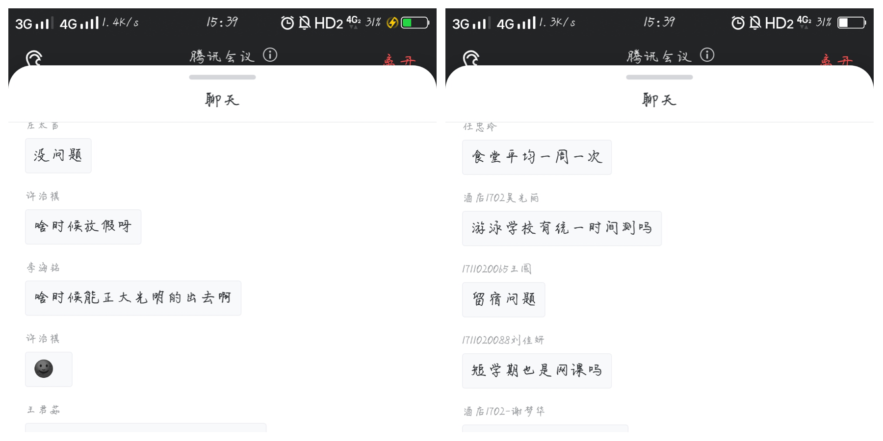 在班会的最后,同学们在聊天区里进行了关于学业、生活以及毕业相关的问题咨询,李琴老师在线逐一耐心解答。