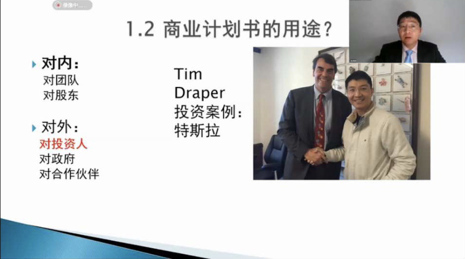 讲座伊始,詹博士为员工们讲解了商业计划书的用途,分为吸引人才的加入、吸引投资人进行投资和为获得政府的支持而制作。不同用途的商业计划书的详略度、要保密的内容以及格式都需要针对性的设计和调整。