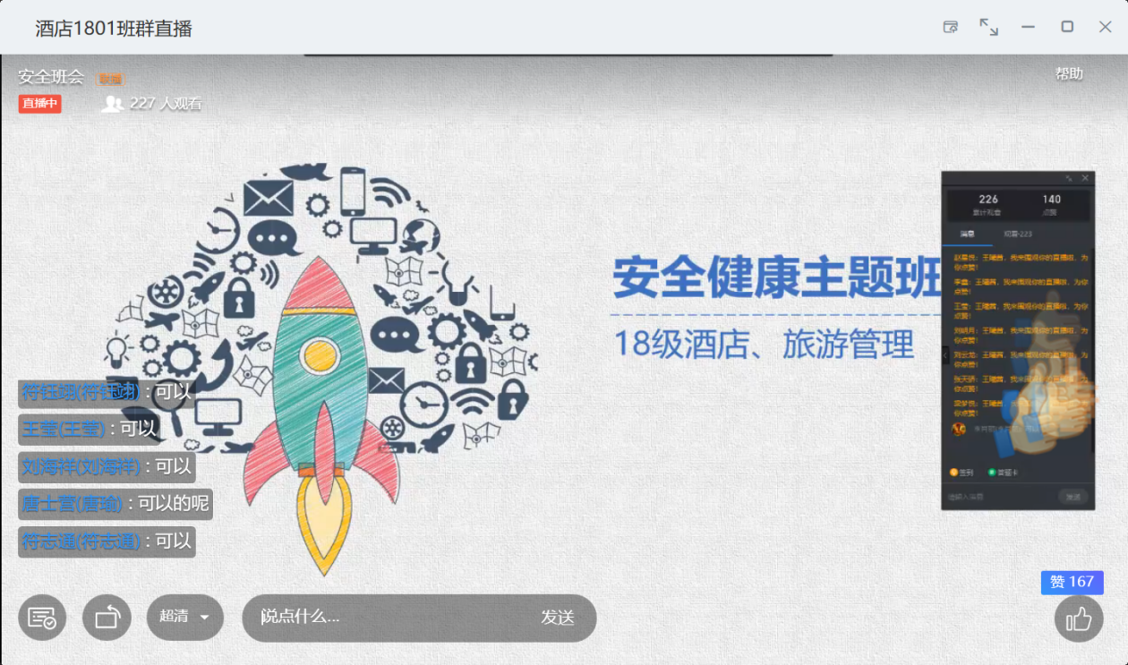 为持续加强员工思想政治教育、进一步切实加强疫情防控期间员工们的安全教育,确保落实2020年秋季新学期员工返校管理工作,太阳集团tyc4633思想导师组织17、18、19级各年级同学们开展暑期线上“安全健康教育”主题班会。