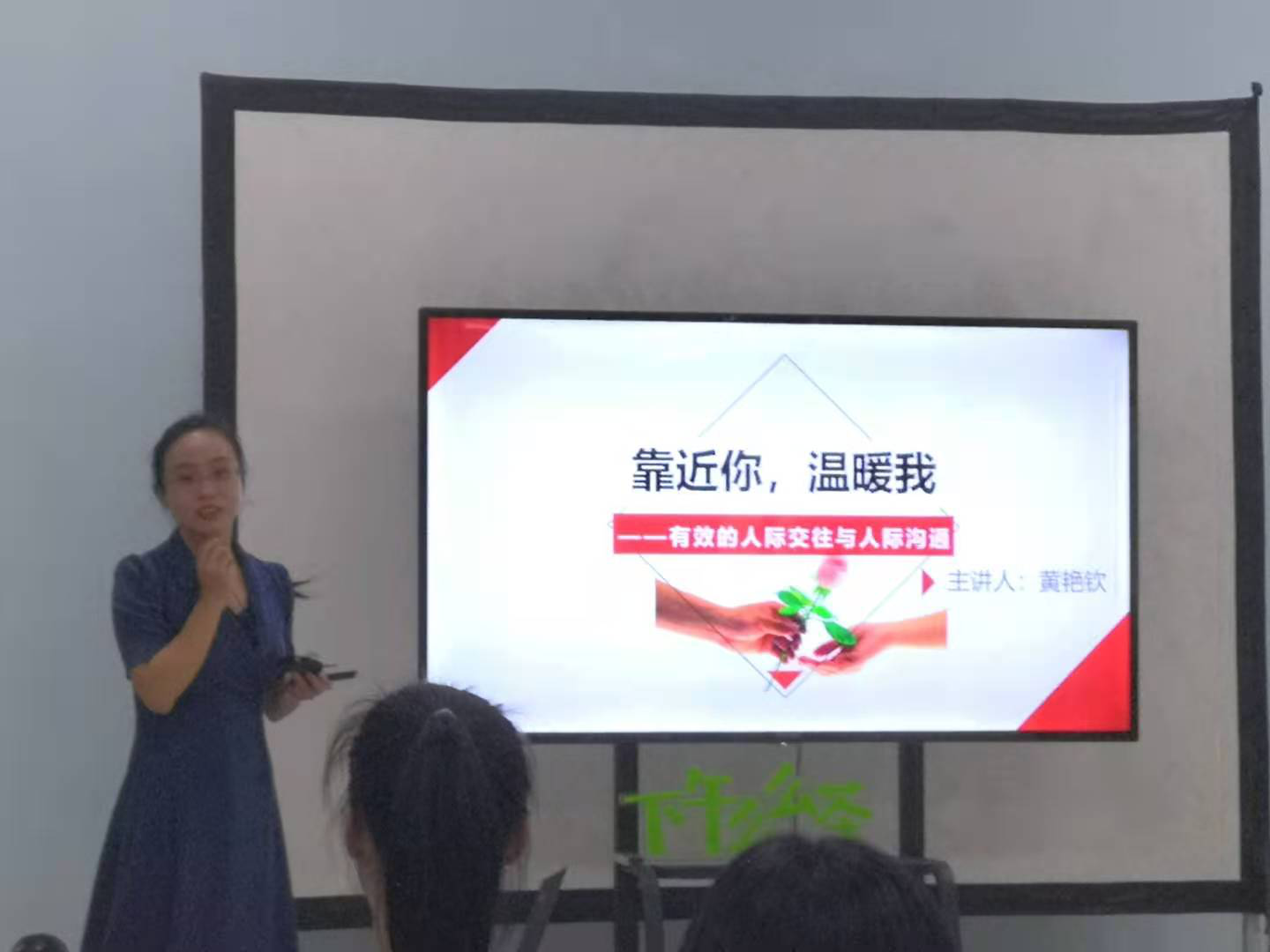 讲座伊始,黄艳钦老师以故事分享作为开场,充分调动了员工的积极性,并引起员工们的好奇心。本次的老员工人际关系讲座主要围绕自我表露和人际沟通技巧两大内容进行讲解。黄老师从自我表露方面切入主题,向员工们讲解了扩展社交渠道的方法。