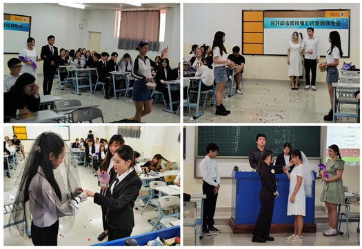 课程伊始,隐约听到了优美的音乐声从书知楼2108教室传出。推开教室的门,装扮、背台词、准备PPT,会展1801班的员工们正在为即将要开始进行的婚礼礼仪与宴会设计课程做课前的小组彩排练习。