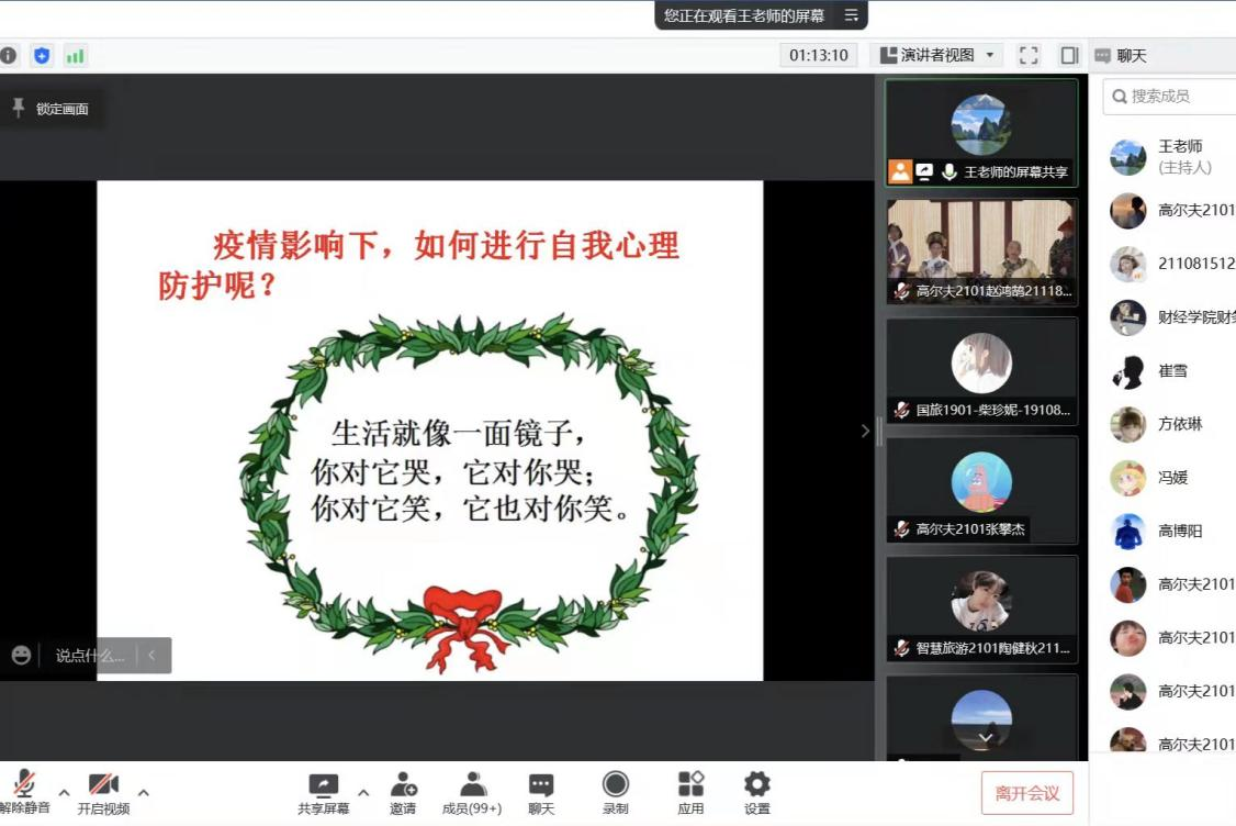 如何应对疫情下不良情绪的方法?王水卿老师从正确认识自己的心境调整良好的心理状态、心理自助方法、如何判断是否需要专业心理援助三个方面进行讲解。会议最后,老师在线上对员工在此次封校中可能遇见的心理问题进行调解,提出了应对方法,并鼓励员工积极调整心态,在校内进行适当的户外运动,锻炼身体。疫情无情,但教育有爱。此次线上会议,让员工感受到了学院的关怀,对学校的防控更加理解,更好的遵循学校的规章。疫情面前,没有谁是一座孤岛,纵使前方荆棘遍布,也要乘风破浪,奔赴前方!