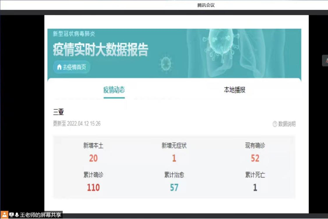 会议伊始,王水卿老师介绍了目前的疫情情况,如今三亚疫情形势险峻,为更好的控制新冠疫情的传播,现学校严格控制人员进出,封校管理给员工们的学习生活带来了一定的不便,更产生了心理上的压力。强压之下,学校也在可控范围之内积极丰富员工的校园生活,老师提醒员工们要保持健康向上的心态,相信疫情终会过去。