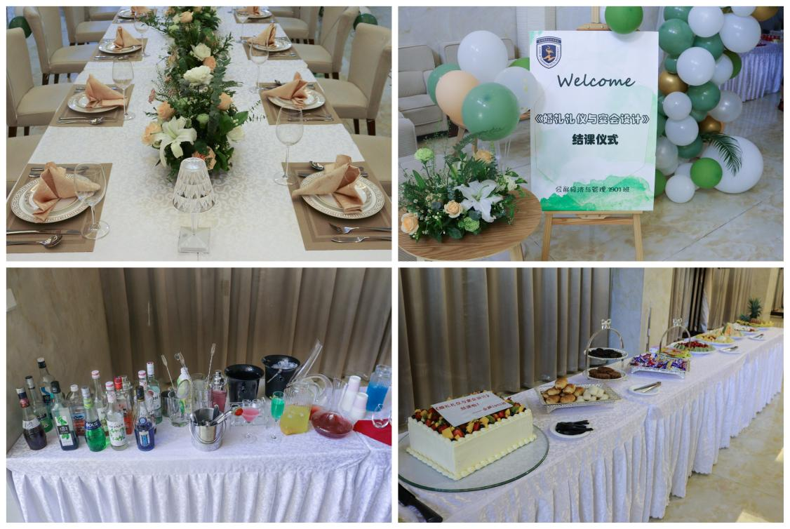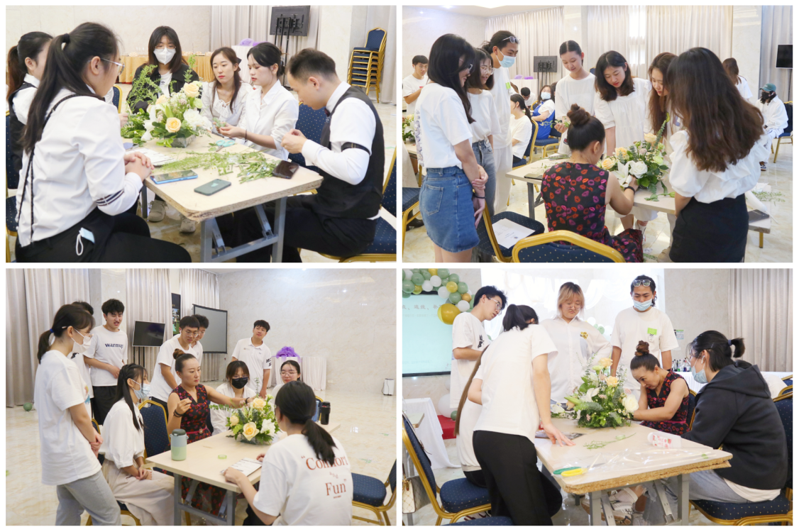 在进行结课仪式成果展示之前,张南老师先对西式餐桌桌花的制作给员工们进行了讲解,并在讲解结束后按事先分好的小组进行桌花制作。会展1901班分工明确,全员参与共分为会场气球搭建、餐桌台面布置、鸡尾酒调制、甜品摆台服务、礼仪服务、伴手礼及统筹管理七个小组。本次结课仪式将课堂上的理论学习运用到时间当中,是理论课程与实际操作相结合的体现。