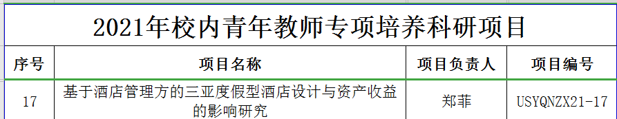 2021年学校开展校内青年教师专项培训科研项目申报,郑菲老师通过项目申报成功立项《基于酒店管理方的三亚度假型酒店设计与资产收益的影响研究》,主要从酒店管理方(运营方)的角度研究三亚度假型酒店设计对资产收益的影响因素以及提升的策略。目前,项目已经完成前期的调研工作,正在进行调研数据和访谈数据的整理工作,利用暑期的时间撰写论文并投稿发表。