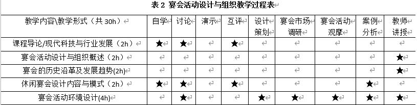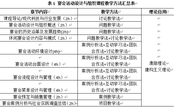 宴会活动设计与组织该门课程综合运用了讨论教学法、问题教学法、团队合作法、案例分析法、互动学习法、项目教学法等教学方法。本门课程针对不同章节的教学内容特点,将选择不一样的教学方法,以达到让员工理解该章节内容,掌握该章节教学目标要求的目的,每章具体内容与相应教学方法的采用详见表1。
