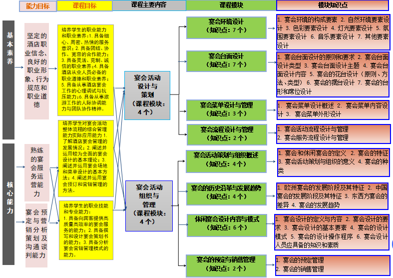 《宴会活动策划与组织》是酒店管理专业的一门专业核心课程。课程教学将能力培养作为核心,贯彻理论联系实际、学以致用和因材施教的原则。课程重点关注员工宴会设计能力,组织与管理能力,运用多种手段对员工的设计和管理能力等方面的培养。通过加强教学的实践性环节,突出应用性,有利于培养员工成为专业的宴会设计与管理人才。