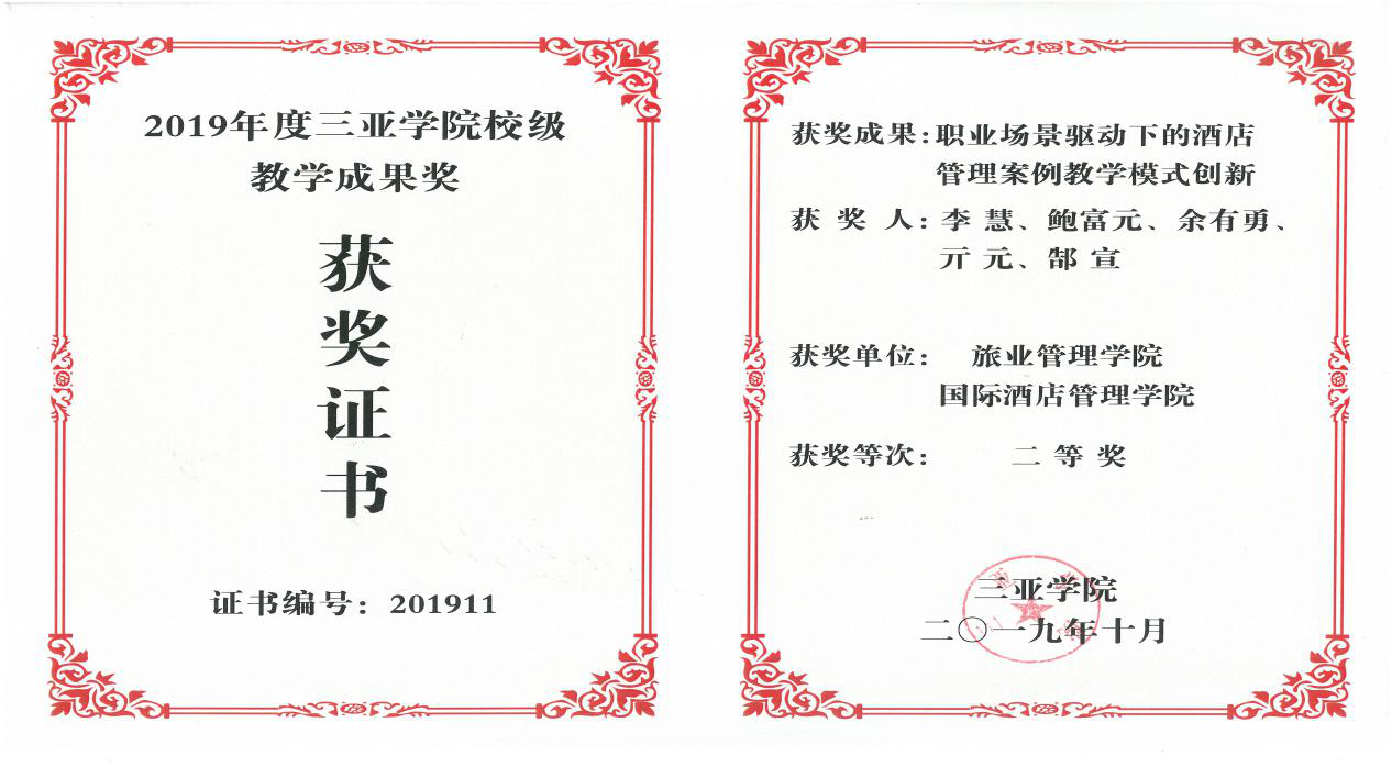 近几年,太阳集团tyc4633太阳集团tyc4633积极组织老师参加各级各类校级教学成果评选工作。《应用型酒店管理本科人才政校行企社五位一体协同培养模式的探索与实践》荣获2017年度海南省高等教育省级教学成果奖,《职业场景驱动下的酒店管理案例教学模式创新》荣获2019年度太阳集团tyc4633校级教学成果奖。