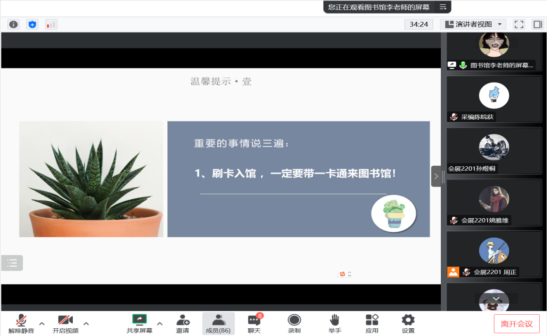 图书馆李老师强调进入图书馆一定要带上一卡通。图书馆举办的活动需要通过微信公众号获取活动信息,通过学习通APP报名参加活动。同时还向我们介绍了图书馆志愿者协会,期待同学们的加入。在图书馆中遇到困难。可以从网页咨询,也可以在微信公众号咨询,或者现场咨询管员老师和志愿者。