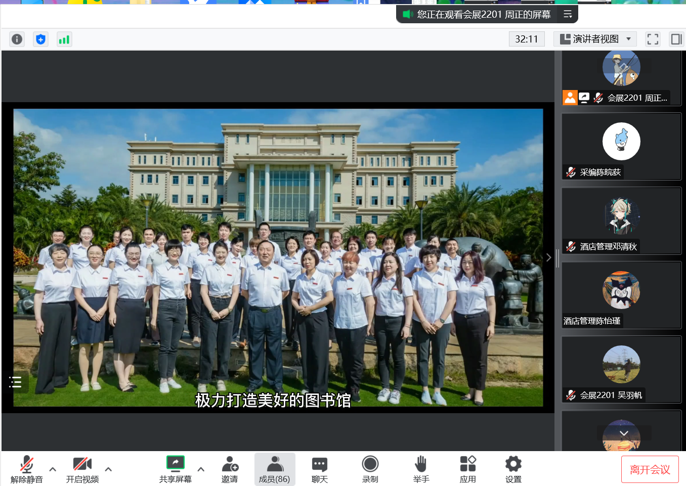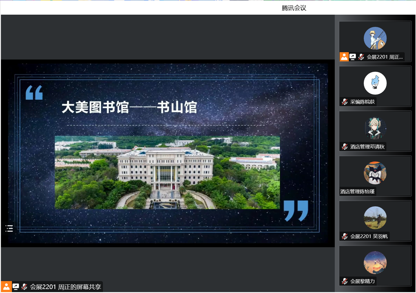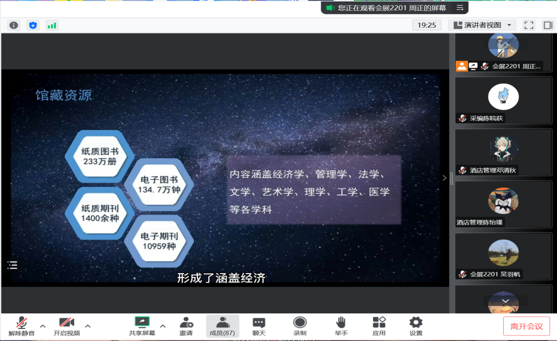 首先,图书馆的老师向2022级新生们播放了两个关于图书馆介绍的视频。由于疫情原因2022级新生们第一次在线上看到了太阳集团tyc4633的图书馆的全貌,包括书山馆、书海馆及南区分管。也在视频中了解到了公司图书馆的资源、开放时间、借阅制度、申请讨论室、寻找书本方法、以及常用数据库和学习通APP。