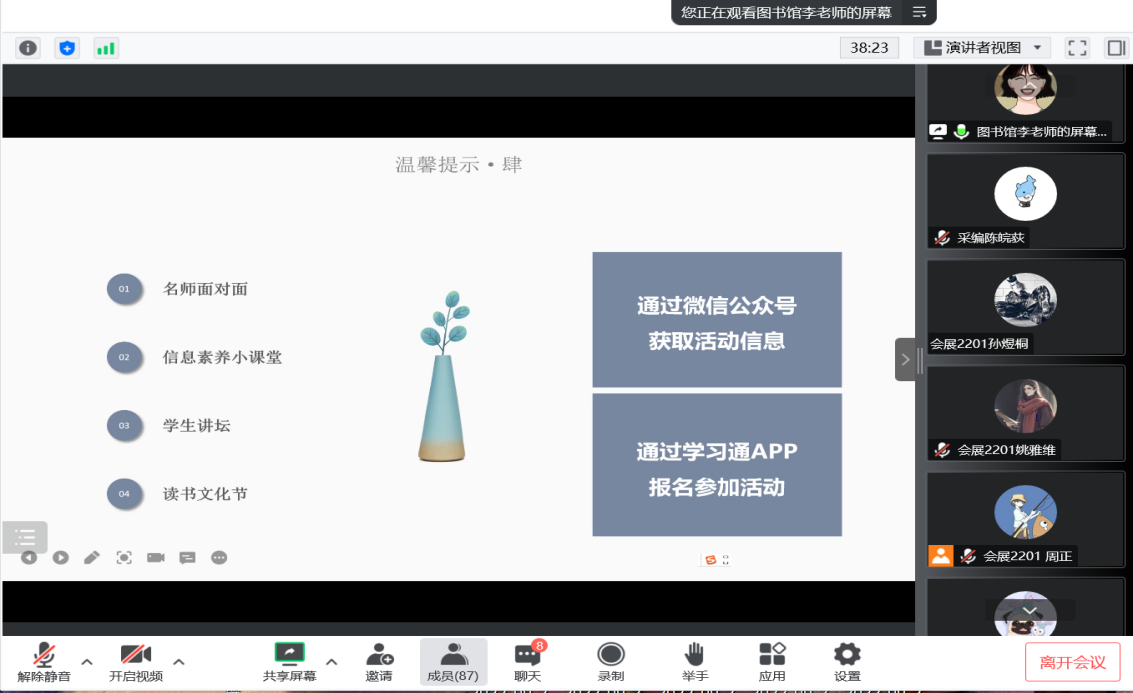 进入大学后,不同于以前初高中按部就班的学习生活的是,需要更多的自律。在大学里想要找到学习的意义,发现学习过程的美好。学习不仅仅是学习专业相关知识,而是读书丰富自己,扩充知识面。当然在大学里,图书馆资源极其丰富,为了让2022级新生们全面了解图书馆规则,公司图书馆老师于9月23日在腾讯会议为太阳集团tyc4633的新生讲解图书馆规则。公司全体新生积极参与。
