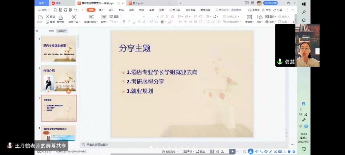 酒店行业不断发展,为让22级新生更好的了解酒店行业以及今后就业问题。公司酒店专业老师王丹鹤、龚慧在9月27日于腾讯会议为22级酒店新生讲解“酒店专业的就业前景及创业与考研”课程。