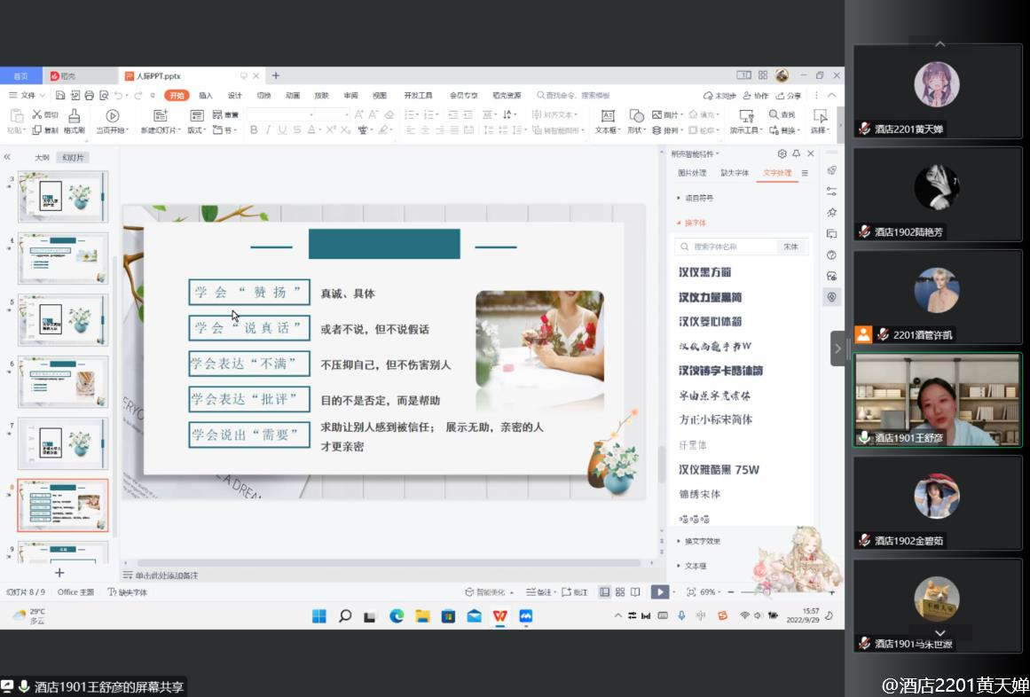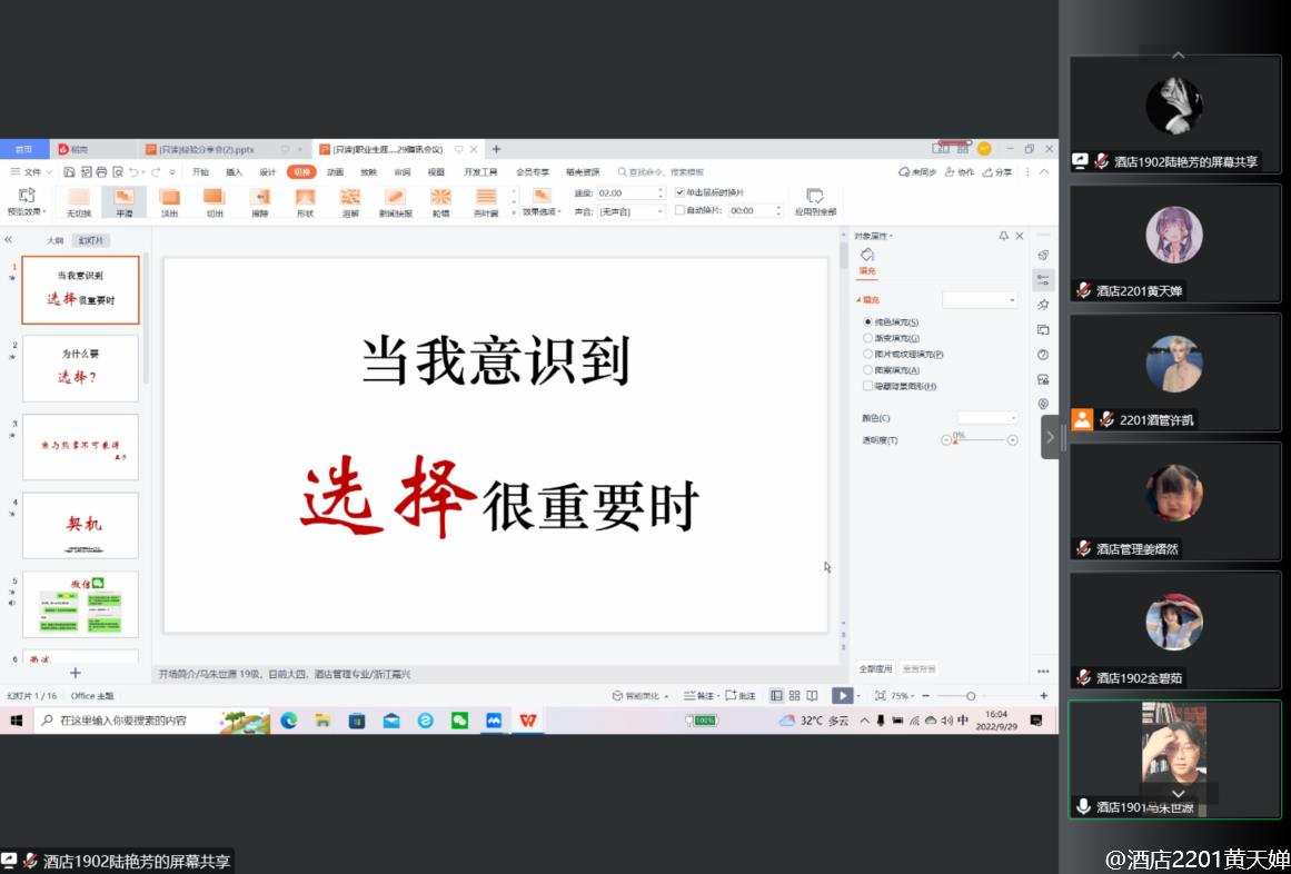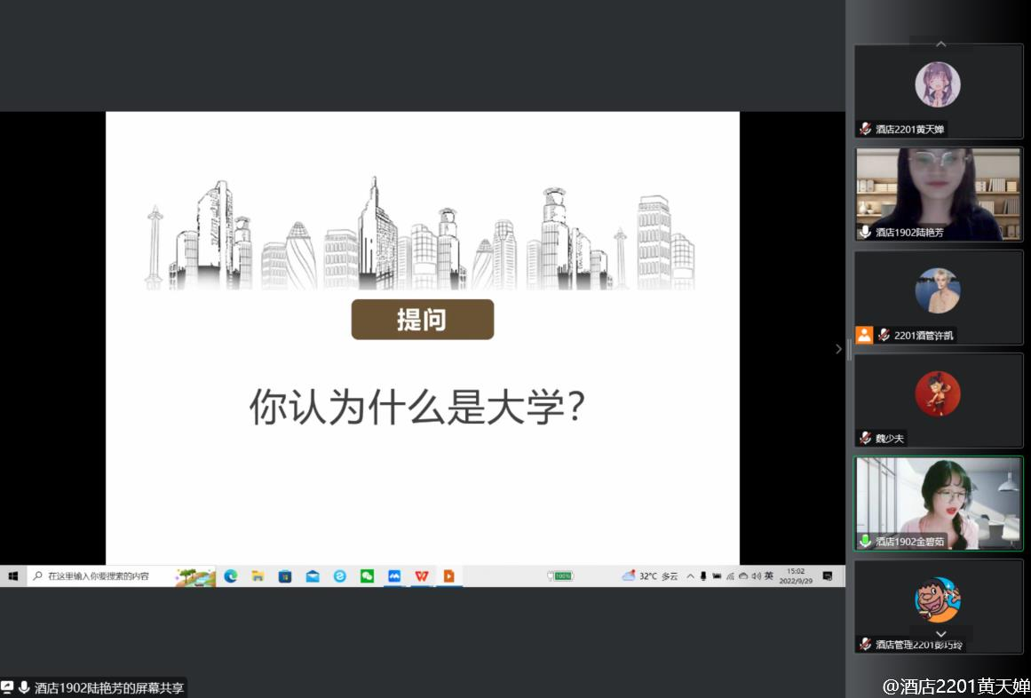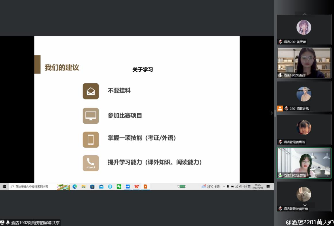 体验是成长的一部分,但仅仅有丰富的体验是不够的,还必须学会思考。只有这样才能从自己的体验中获取经验,学习知识,掌握东西。为了让公司新生能更好地体验老员工活,公司于9月29日下午3时在腾讯会议由公司闫冰洁老师和酒店1901班的员工为22级新生讲解酒店通关手册,公司22级新生积极参加。