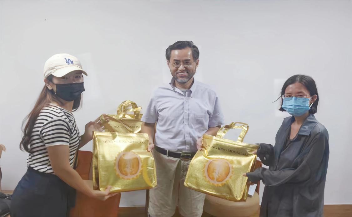 即使中秋的团圆时刻不能和家人一起度过,但在学校老师们的互相陪伴下,感受到特别的温暖和安心。采购到月饼后,由郜宣副经理代表公司分工会为所有老师们分发月饼。