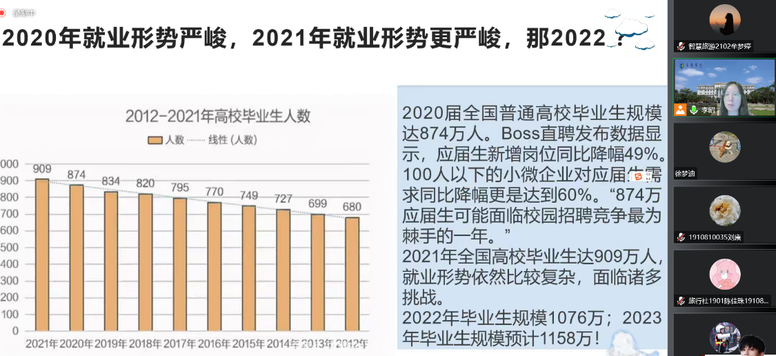 在疫情的影响下,旅游业受到了重创,为进一步加强毕业生对就业形式的认识,增强就业观念,提高自身竞争能力。公司于11月21日19时,在腾讯会议召开了新形势下旅游管理毕业生如何就业的会议。由公司李昭讲师举行会议,2019级毕业生部分员工出席了本次会议。