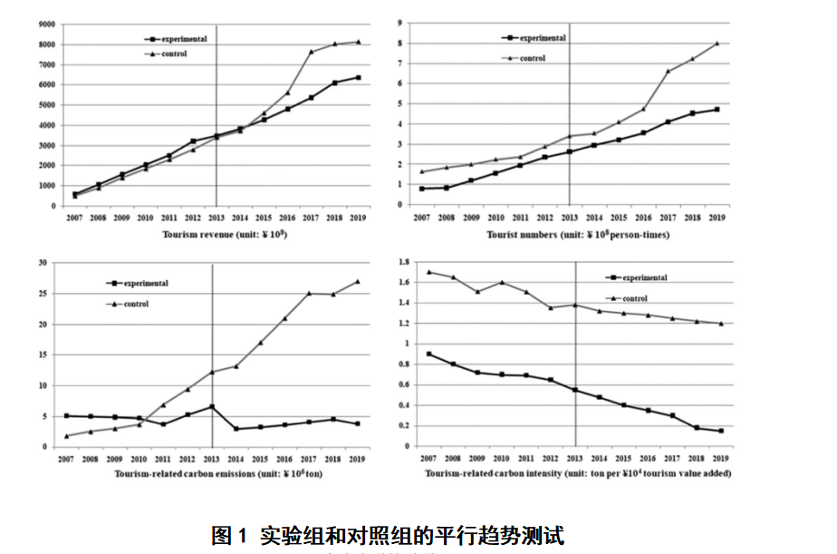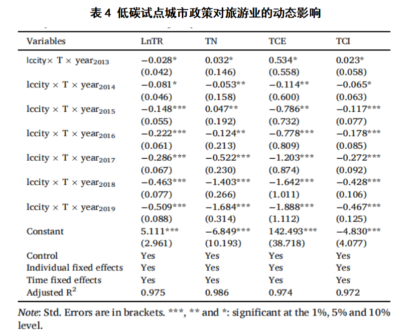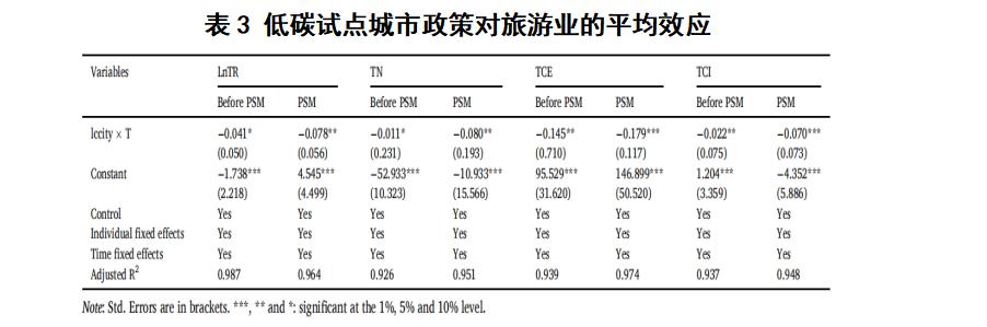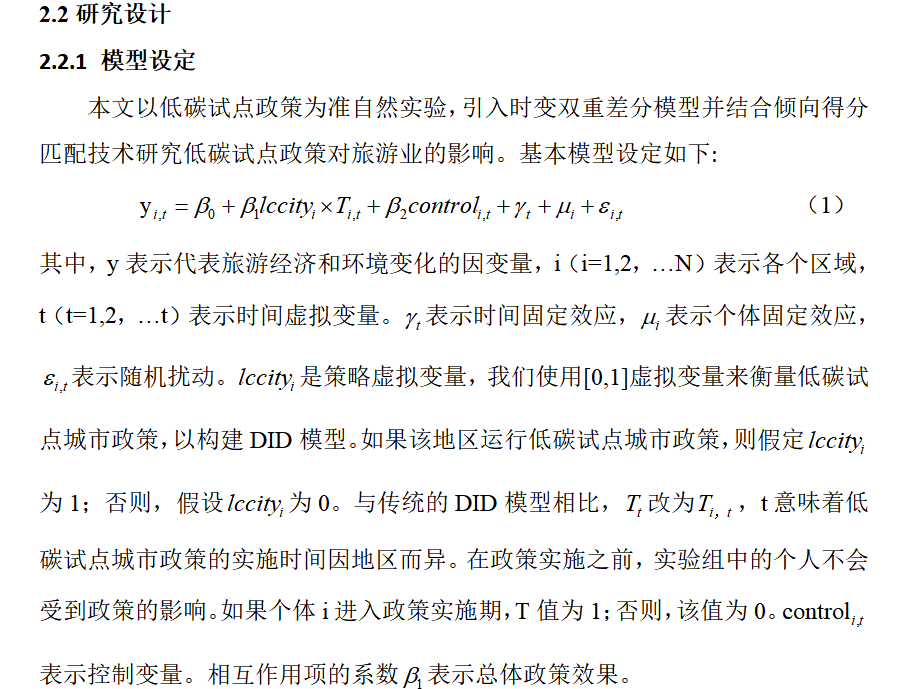 在科研方面,王老师现阶段重点在低碳经济,通过阅读相关理论和文献,学习《高级计量经济学》中的“双重差分法”,并利用该方法初步完成了实证论文:《低碳城市试点对旅游业转生升级的影响机制研究》,改论文模型和部分数据分析如下: